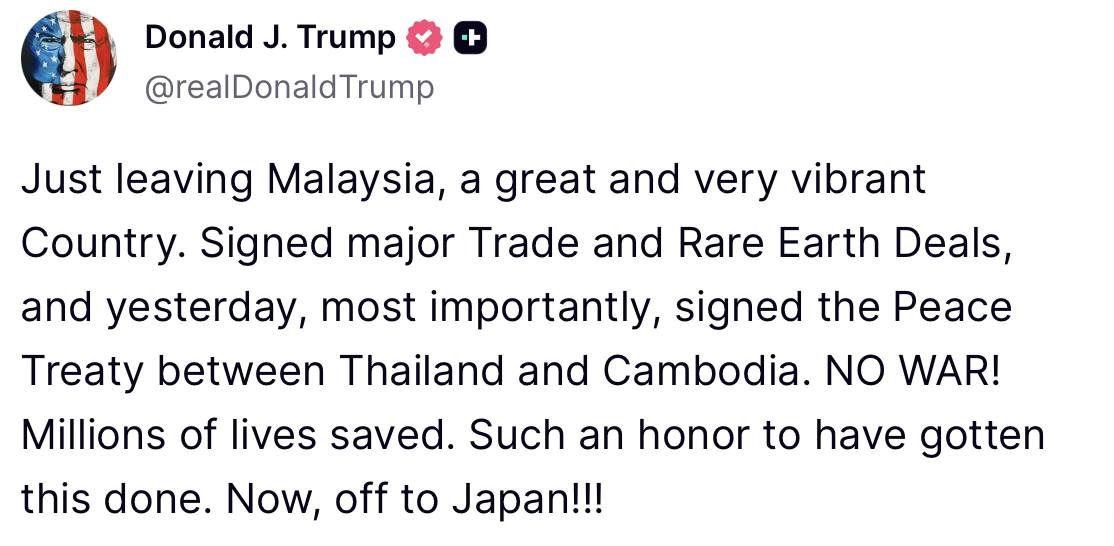 “我们签署了重大的贸易与稀土协议,昨天最重要的是促成了泰国与柬埔寨之间的和平条约。没有战争!