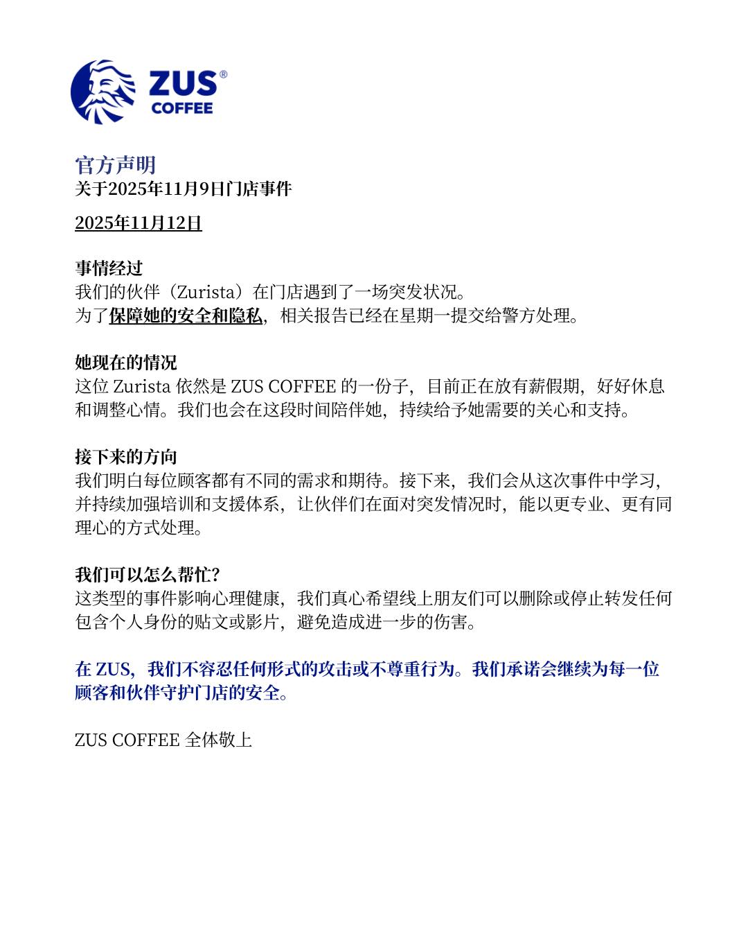 “这位女员工依然是ZUS的一份子,目前正在好好休息和调整心情。我们也会在这段时间陪伴她,持续给予她需要的关心和支持。”