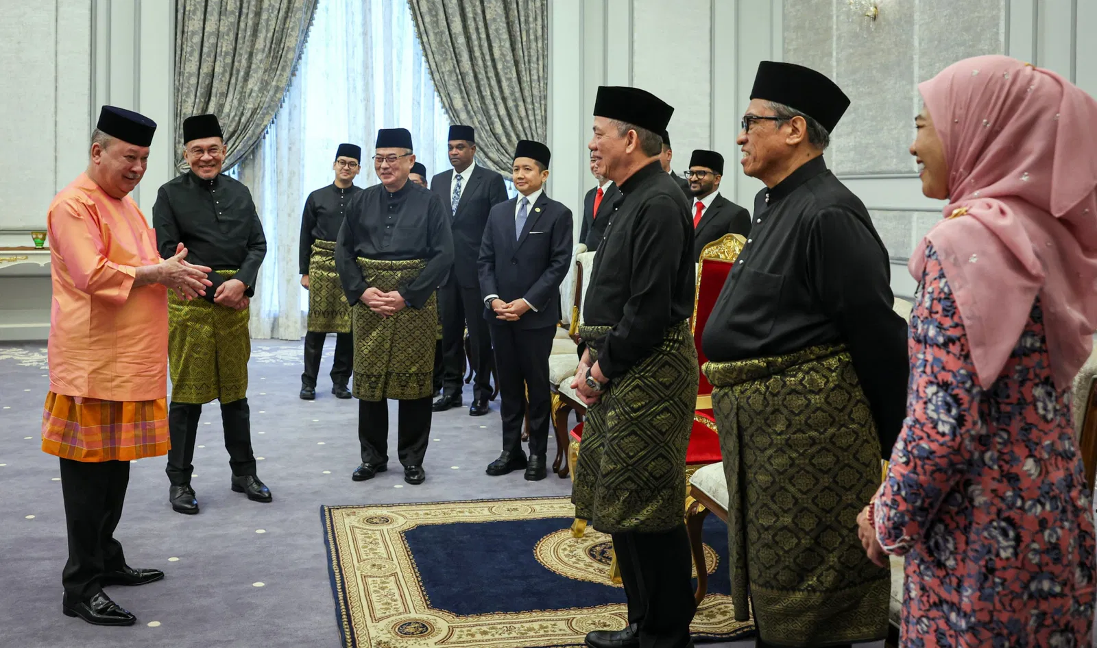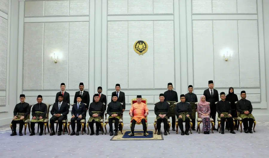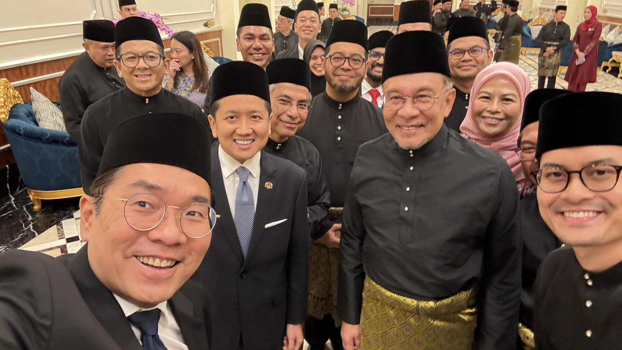 内阁新阵容昨日公布后,7名新任部长和8名副部长今日在国家王宫向国家元首苏丹依布拉欣宣誓就职,首相兼财政部长安华也出席了今早10时举行的委任状颁发仪式,仪式包括就职宣誓和保密宣誓;仪式结束后,一众正副部长与首相安华合影留念,现场气氛轻松愉快。