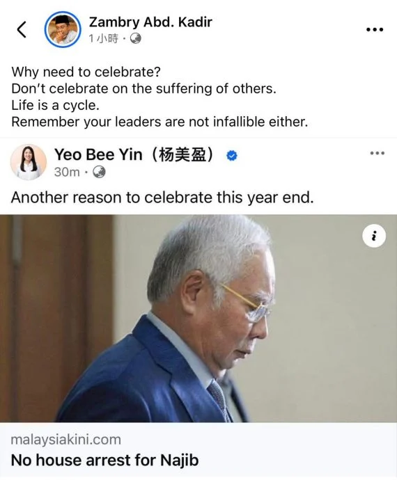 巫统最高理事赞比里也在其个人脸书发文回应,语气严厉,直指不应在他人处境中“庆祝”,并提醒政治人物并非完美无缺,“人生是循环的”,相关言论迅速引发大量网民涌入留言区展开激烈论战。
