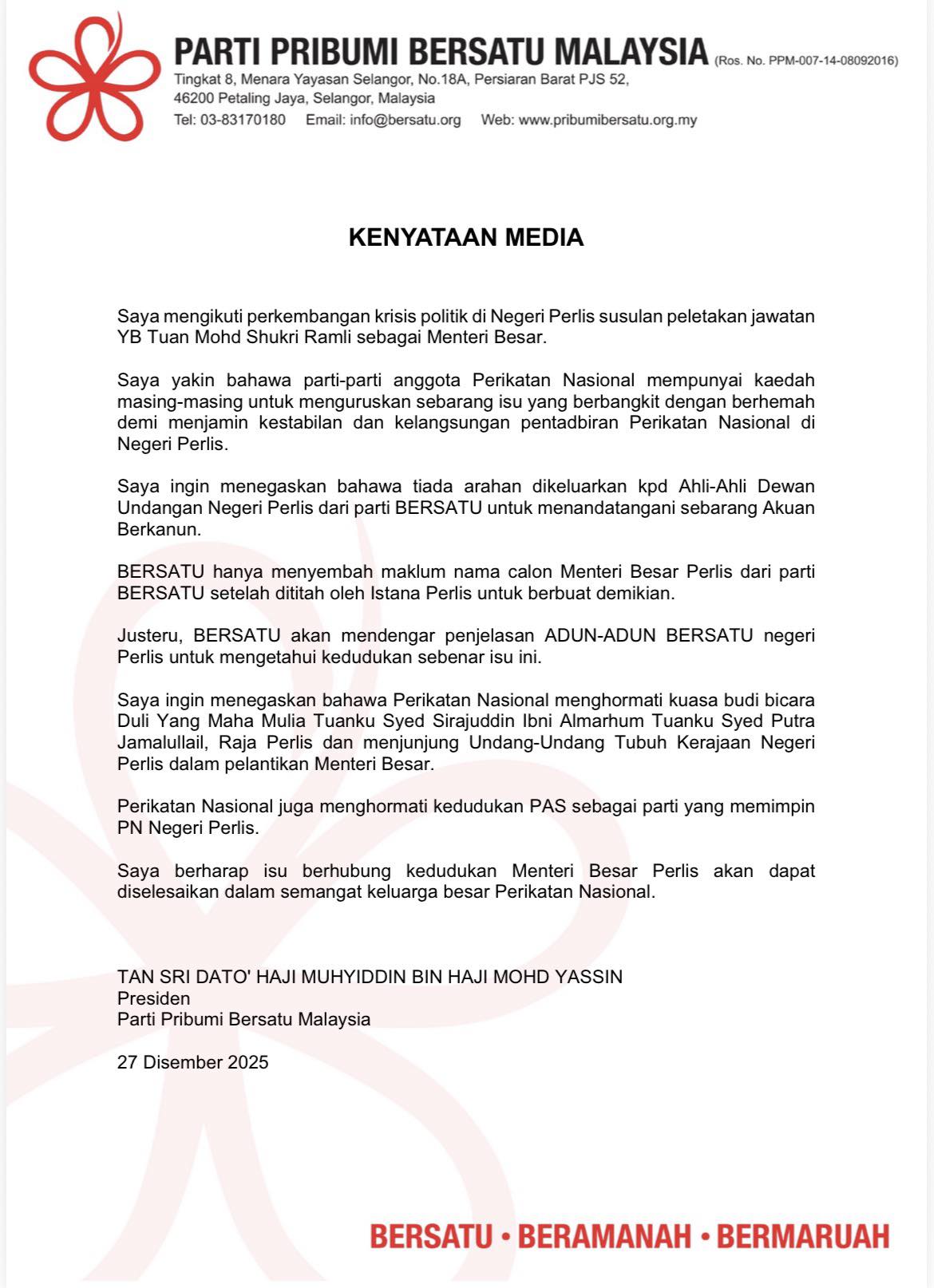 土团党主席慕尤丁表示,土团党从未指示玻璃市州议员签署任何法定声明,并强调该党是在接获玻州王宫谕令后,才提呈州务大臣人选。