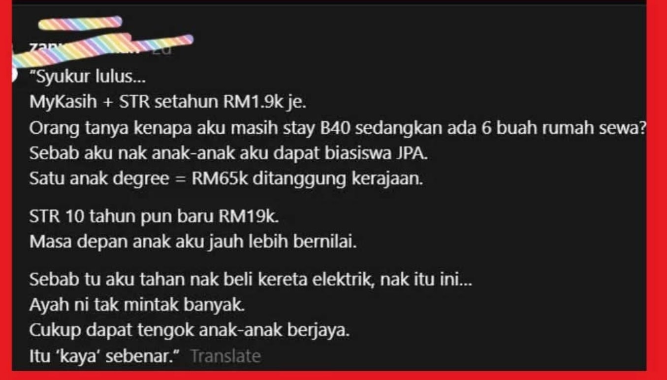 早前,该男子在社交平台Threads发文,自称自2007年起购入6间出租房,却仍每年领取总额1900令吉的两项援助金,并坦言为让孩子符合公共服务局(JPA)奖学金资格而“维持”B40身分。