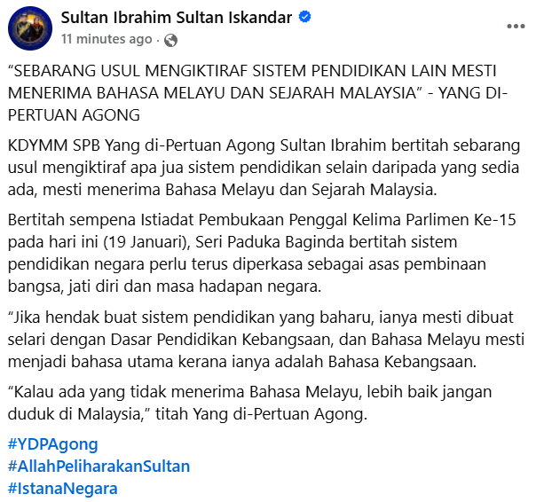 国家元首苏丹依布拉欣强调,任何承认其他教育制度的倡议,都必须接受马来语和马来西亚历史,若有人不接受马来语,那不如不要住在马来西亚。