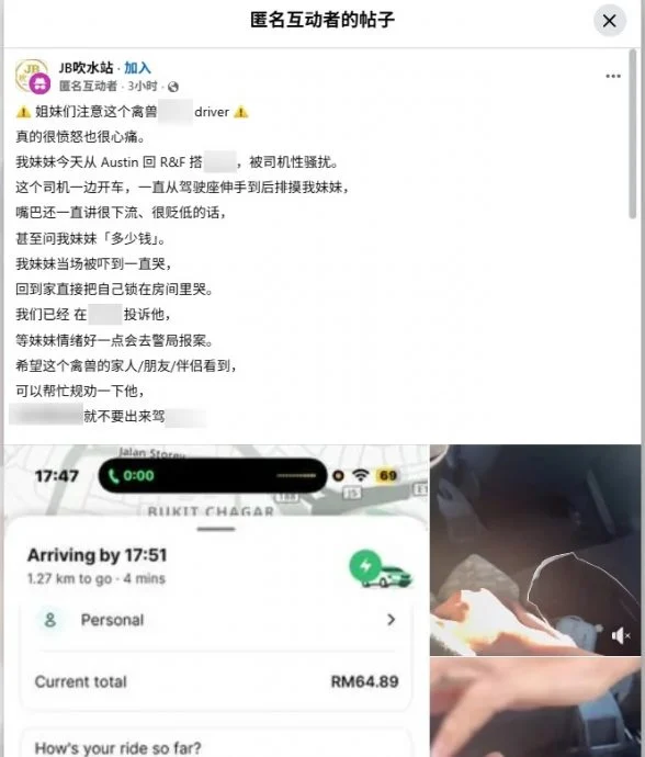 家属指出,事发时其妹妹从新山茂奥斯汀一带搭车前往富力公主湾。事后他们已第一时间向相关平台投诉,并在妹妹情绪稍为稳定后陪同报案,寻求法律途径处理。