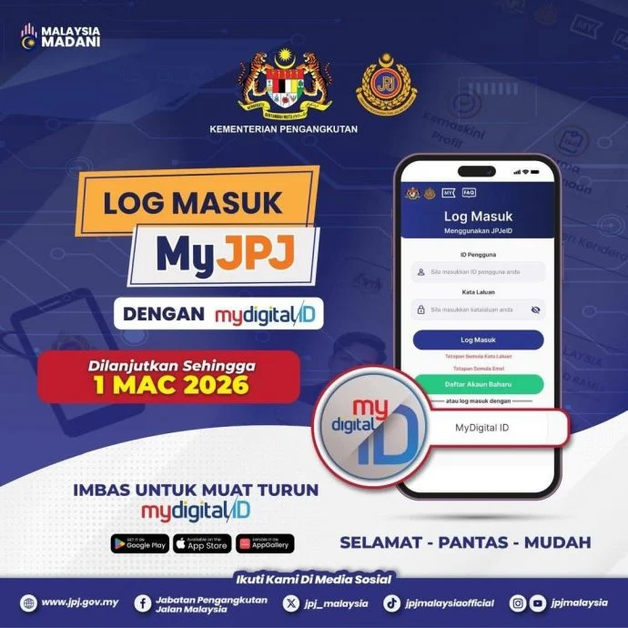 该局早在去年11月曾宣布,从今年2月1日起,年满18岁的马来西亚用户须以 MyDigital ID 取代现有方式,作为登入 MyJPJ 的主要认证途径。