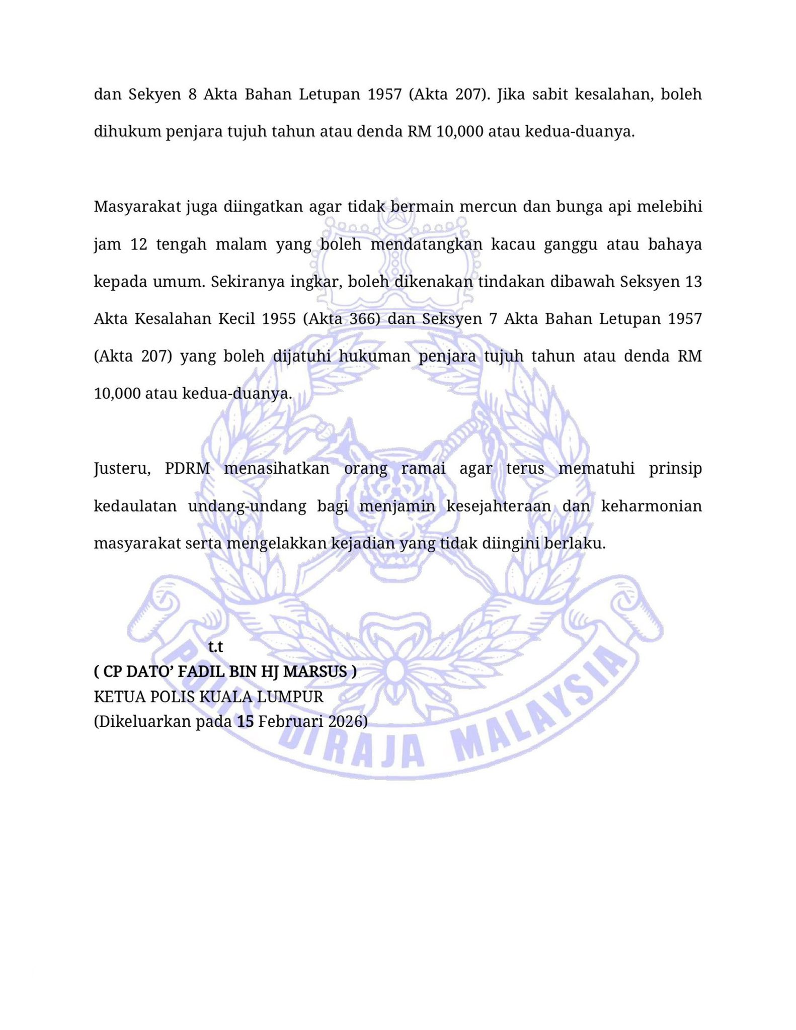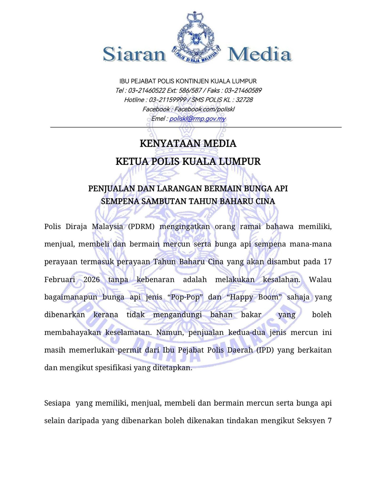 吉隆坡总警长法迪尔发文告指出,持有、售卖、购买或使用未经批准的烟花皆属违法,即使售卖获准类型,也须并各区警区总部申请准证。