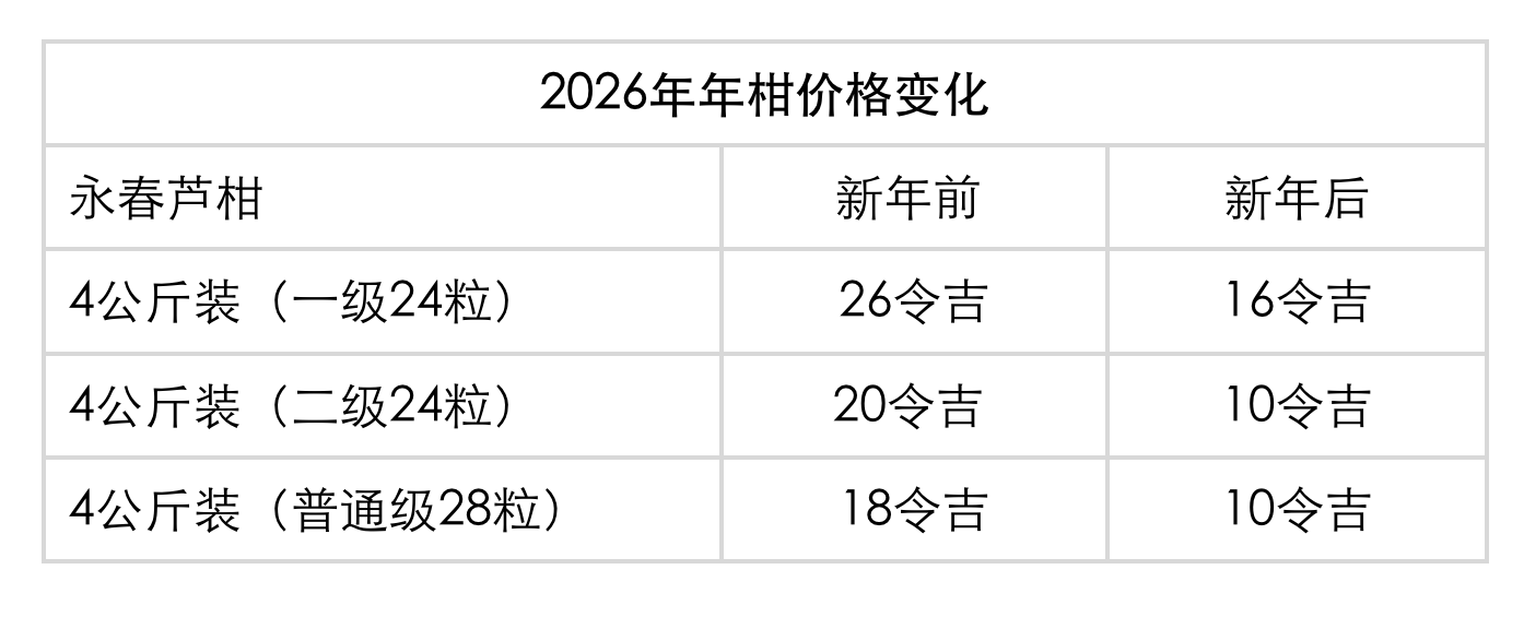 综合报道,目前除“春见”耙耙柑及“红美人”外,多数年柑价格跌幅超过一半。以永春芦柑为例,新年前4公斤装(一级24粒)售价26令吉,现跌至16令吉;二级与普通级分别从20令吉和18令吉降至10令吉。