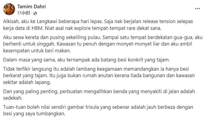 达敏在脸书发文说明事件经过。他表示,当时正前往浮罗交怡旅游放松心情,并计划探索一些鲜为人知的景点。在租车环岛途中,他在一处靠近洞穴的地点停下休息,并顺手喂食野生猴子时,发现地上有一根尖锐、生锈的混凝土铁棒。