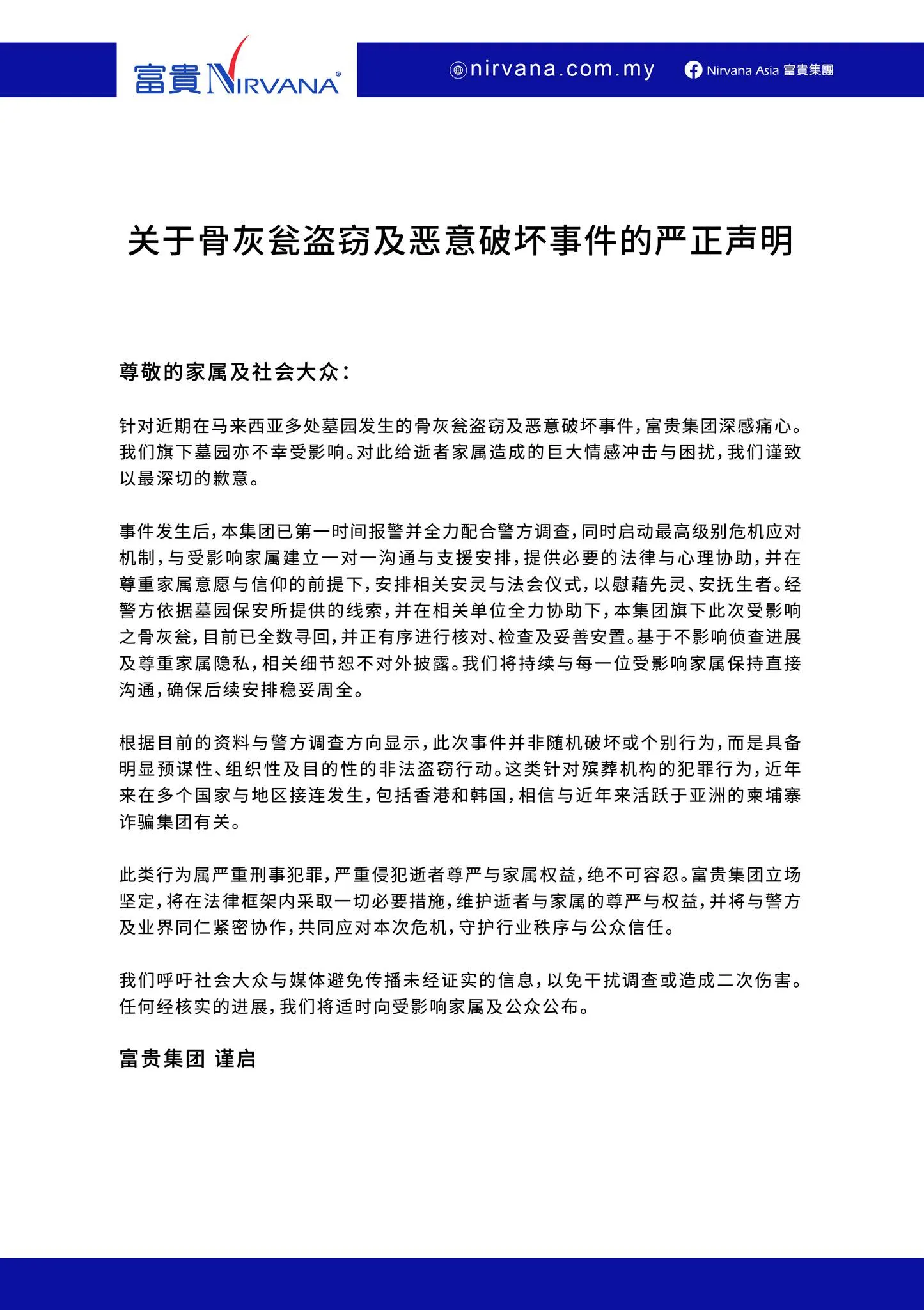 对此,富贵集团今天正式发文告,证实旗下的墓园近期确实发生骨灰瓮失窃事件,并已在警方与相关单位协助下,全数寻回。