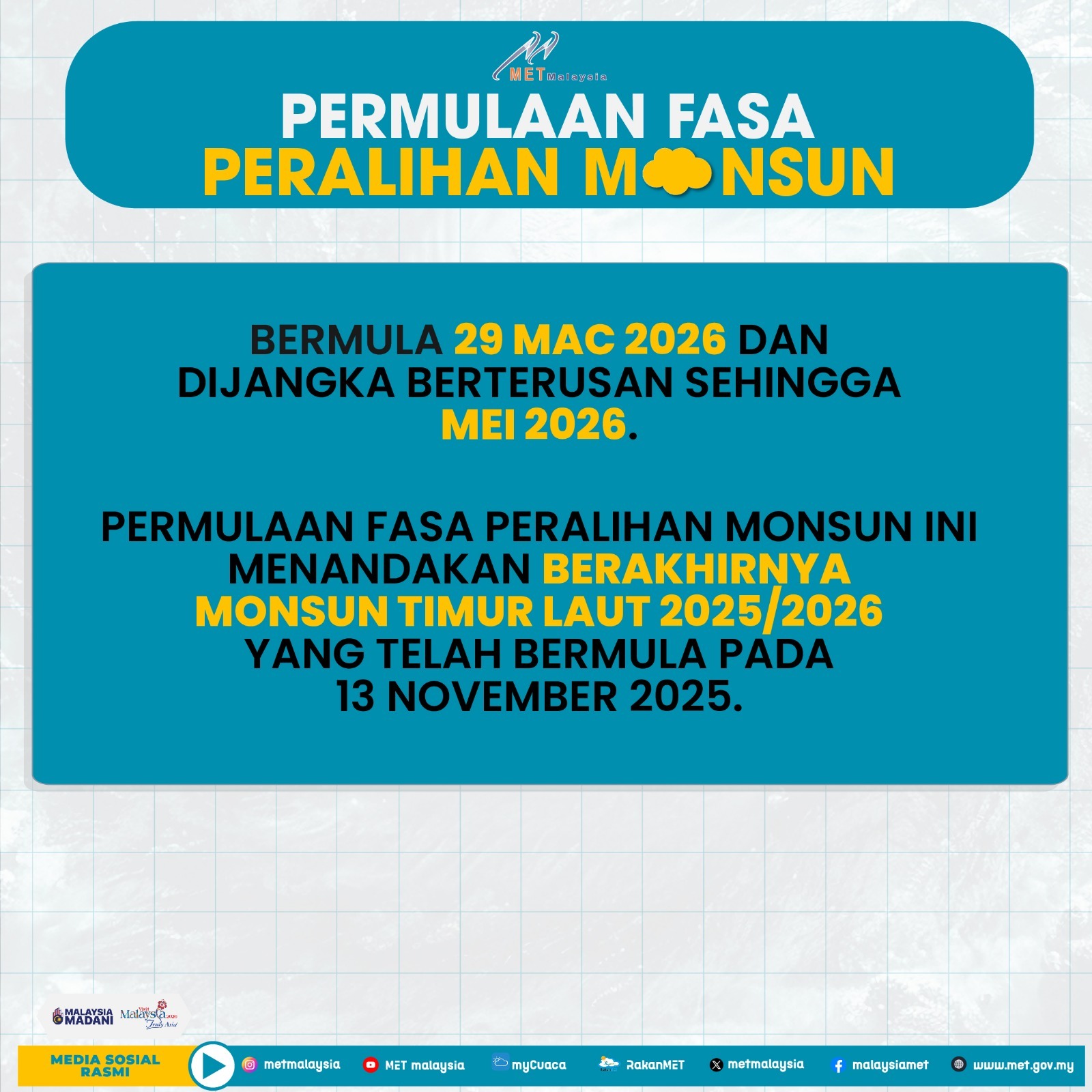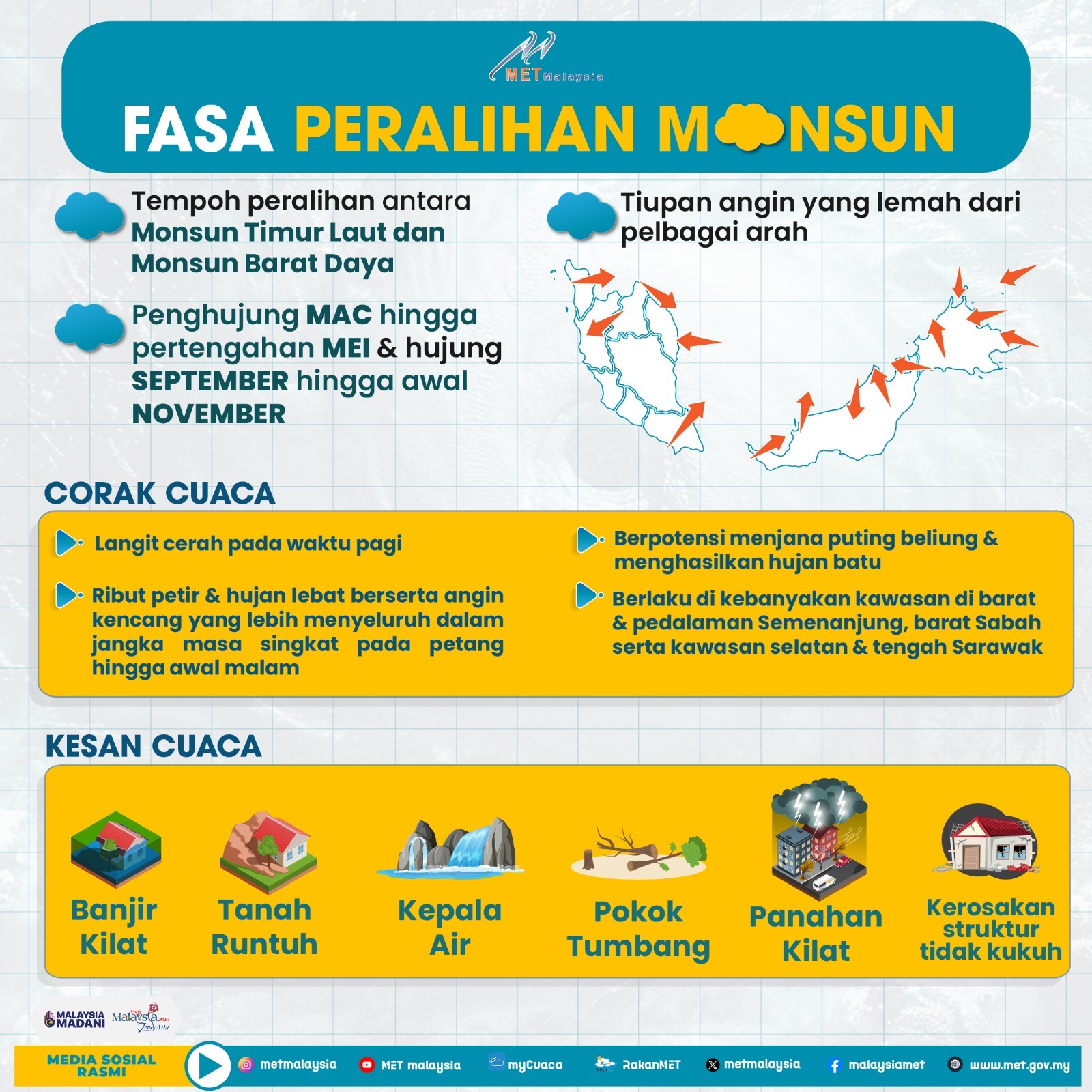 大马气象局指出,季风交替期预计自本月29日(周日)开始持续至5月,届时大部分地区可能出现雷雨及强风暴雨。