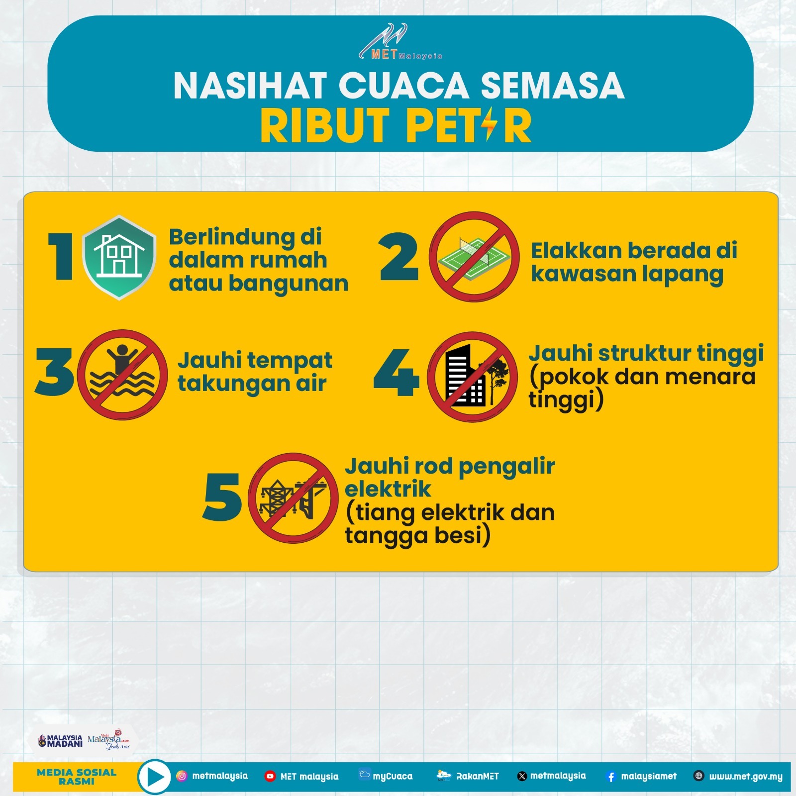 公众应留在室内避险,远离空旷地、蓄水区、高大建筑、树木、塔楼、避雷针、电线杆及铁制梯子,并关注气象局官网、myCuaca应用及官方社交媒体的最新天气预报与警报。