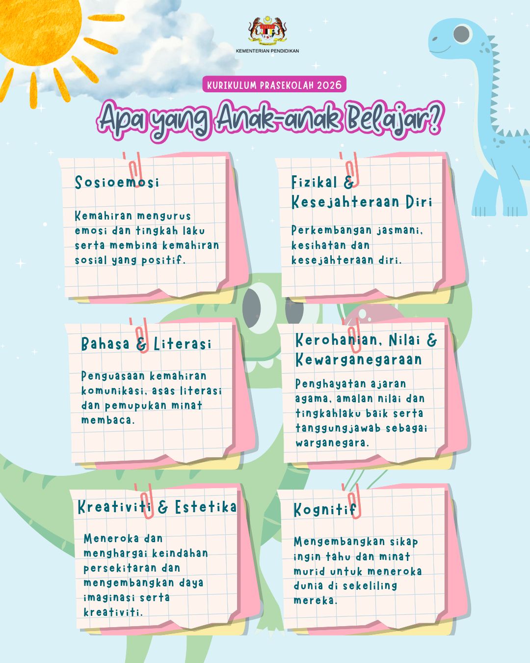 教育部长法丽娜指出,今年实施的全新学前教育课程聚焦六大领域:社会情绪、体能与个人健康、语言与读写能力、精神、价值观与公民教育、创意与审美,及认知能力。