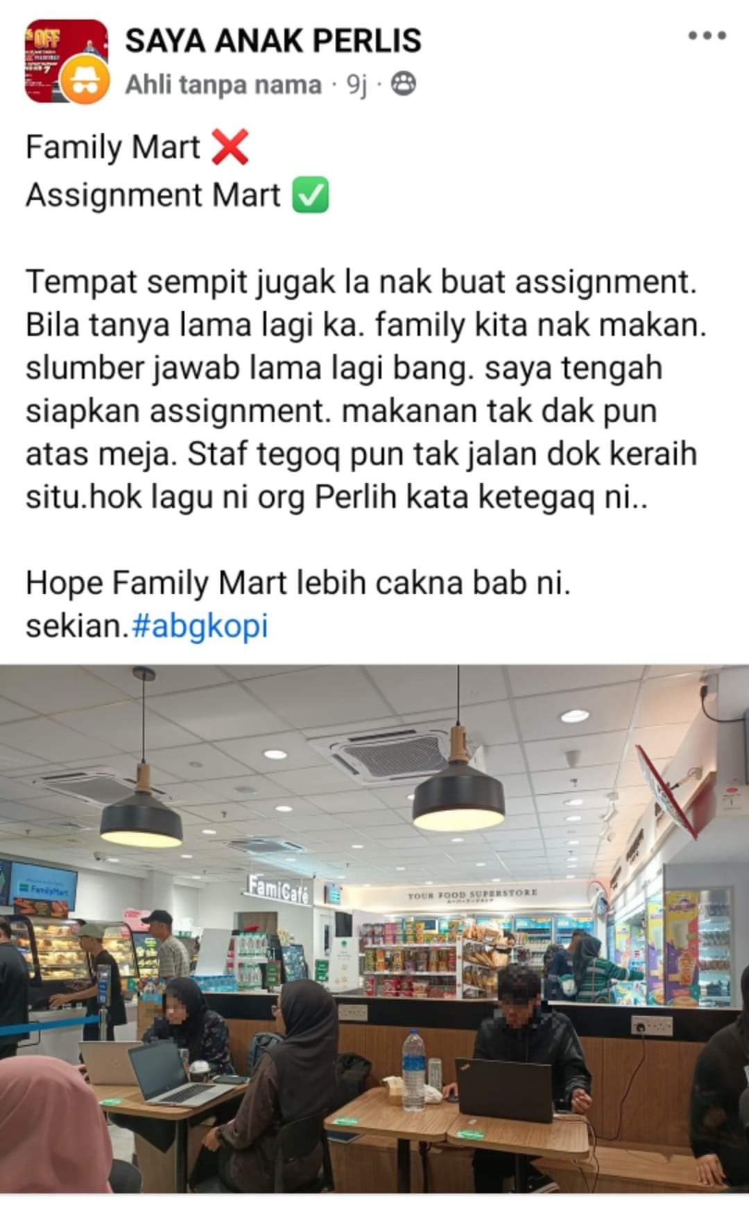 社交媒体X平台账号@isusemasaviral日前转发一张脸书专页“SAYA ANAK PERLIS”的帖文截图,内容为一群学生在全家便利店内,霸占桌椅做功课,并打趣写道:“之前是麦当劳,现在是全家便利店。”