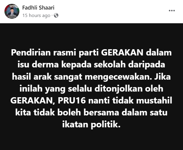 阿末法德里在脸书发文表示:“如果民政党继续维持这样的主张,那么在下届大选中,我们很可能无法继续合作。”
