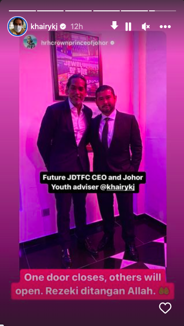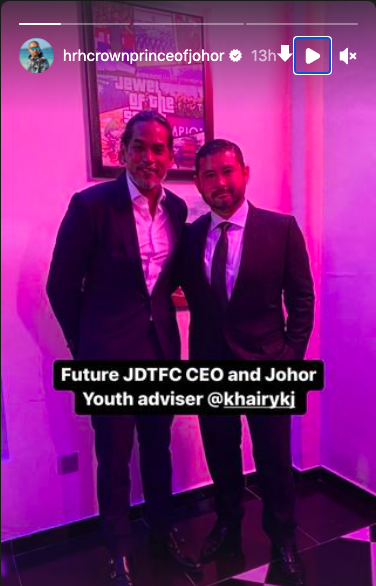 柔佛王储东姑依斯迈在IG限时动态中,上载与凯里的合照,写到:“未来JDT总执行长及柔州青年顾问”。