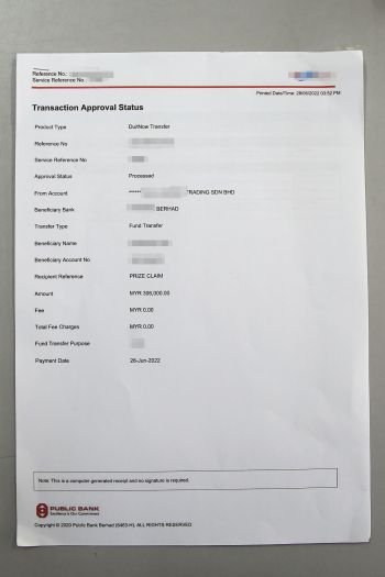 以为中了头奖,付了5万令吉手续费,却拿不到30万奖金!