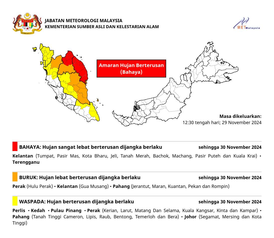 大马气象局已发出预警,8个州属的多个地区会持续降雨,直至明天,登嘉楼和吉兰丹被列入危险水平。
