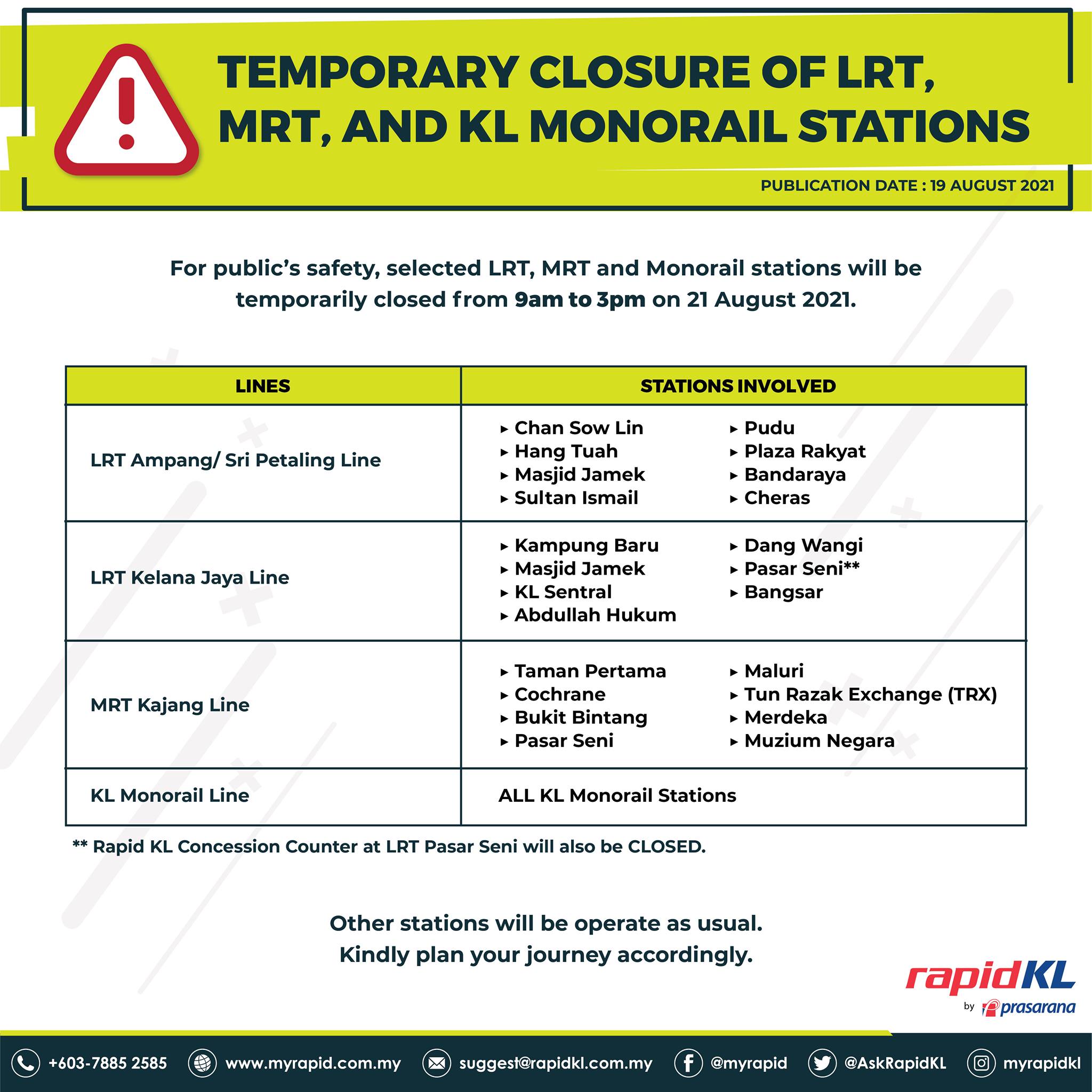 此外,Rapid KL也宣布,基于公共安全理由,旗下的捷运、轻快铁及单轨火车34个站,今早9时至下午3时暂停运作。