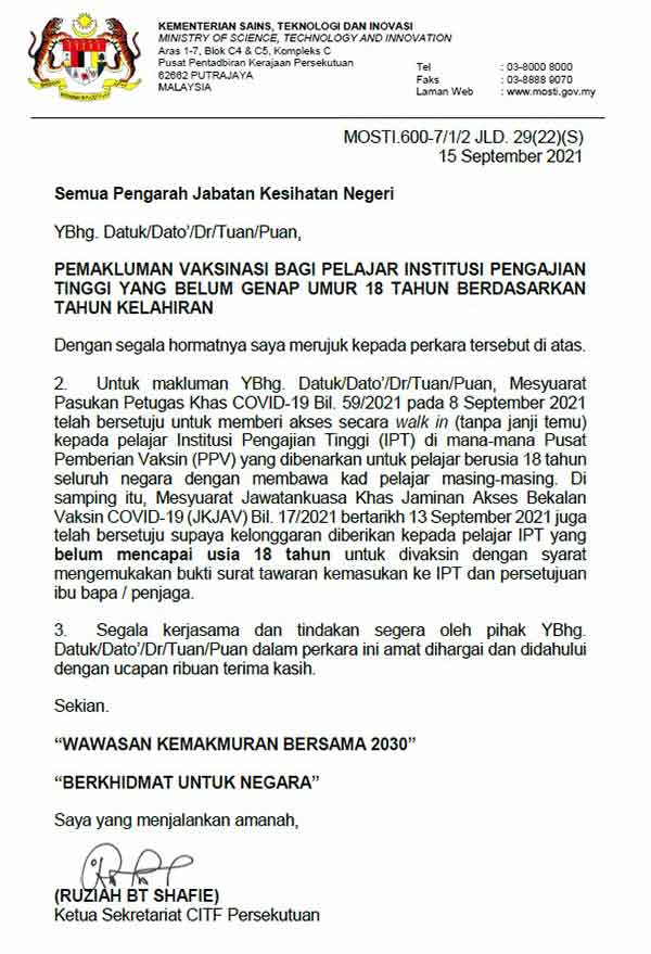 全国冠病疫苗免疫协调特别工作队(CITF)秘书长鲁西亚宣布,未满18岁的大学生,只须携带大马卡、入学录取通知书及父母同意书,就可直接到允许登门接种的疫苗接种中心(PPV)接种。