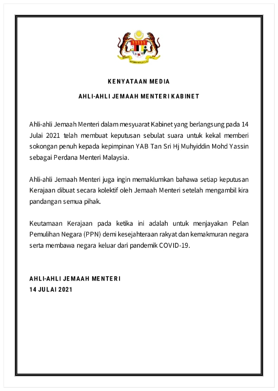 内阁部长发表联合声明,一致同意继续支持慕尤丁任相!