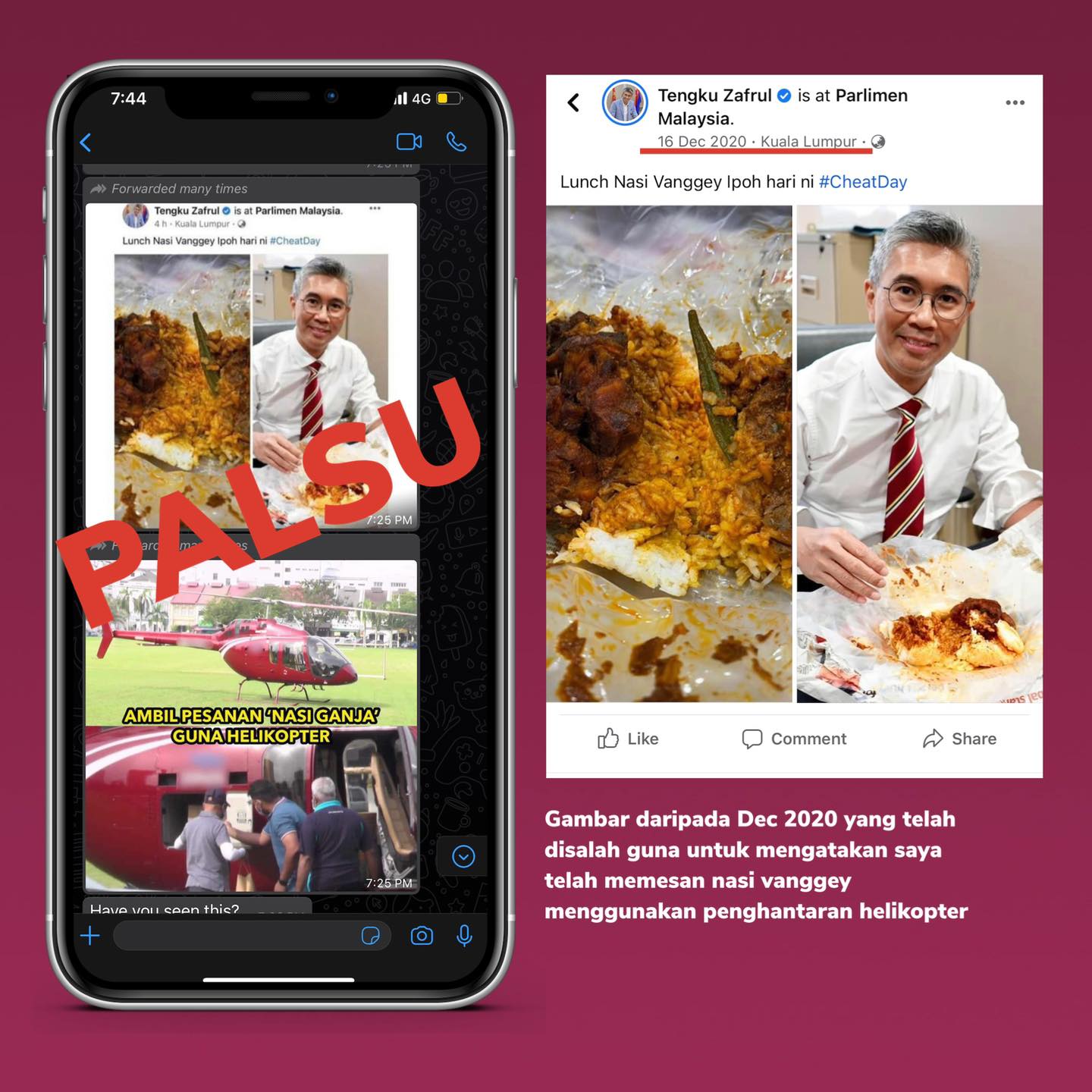 “真是有趣,当我收到WhatsApp的转发信息,声称我用直升机去了怡保买Nasi Ganja扁担饭。他们利用我于2020年12月享用Nasi Vanggey的旧照片,但裁掉了日期。