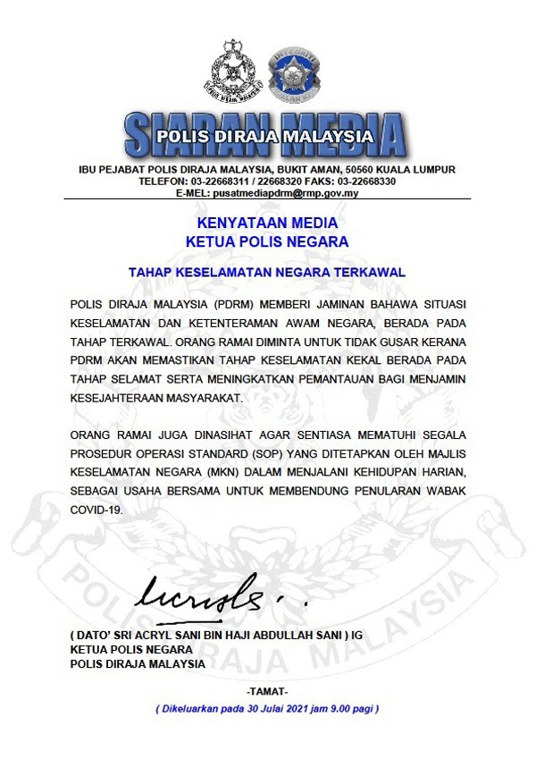 国家元首昨日发布的文告,在国会引起纷扰后,警方今早发文告保证,我国安全和公共秩序都在可控制范围,民众受促保持冷静。