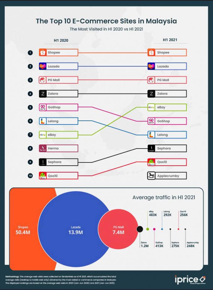 iPrice Group和SimilarWeb是针对马来西亚电子商务平台,分析2021年上半年排名前十的电子商务公司及其增长。