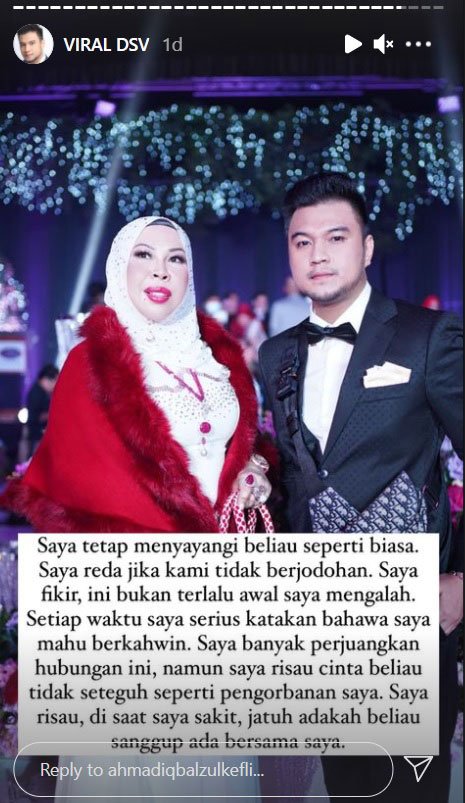 原名哈斯米查奥斯曼的维达,下个月即将迈入庆祝50岁生日。维达与阿末依克巴两人是在2017年认爱而引起各界哗然,因为阿末依克巴是她当时的私人助理,兼且年龄差距足足23岁。阿末依克巴在其Instagram限时动态发文指出,若哈斯米不愿与他结婚,他尊重对方感受。