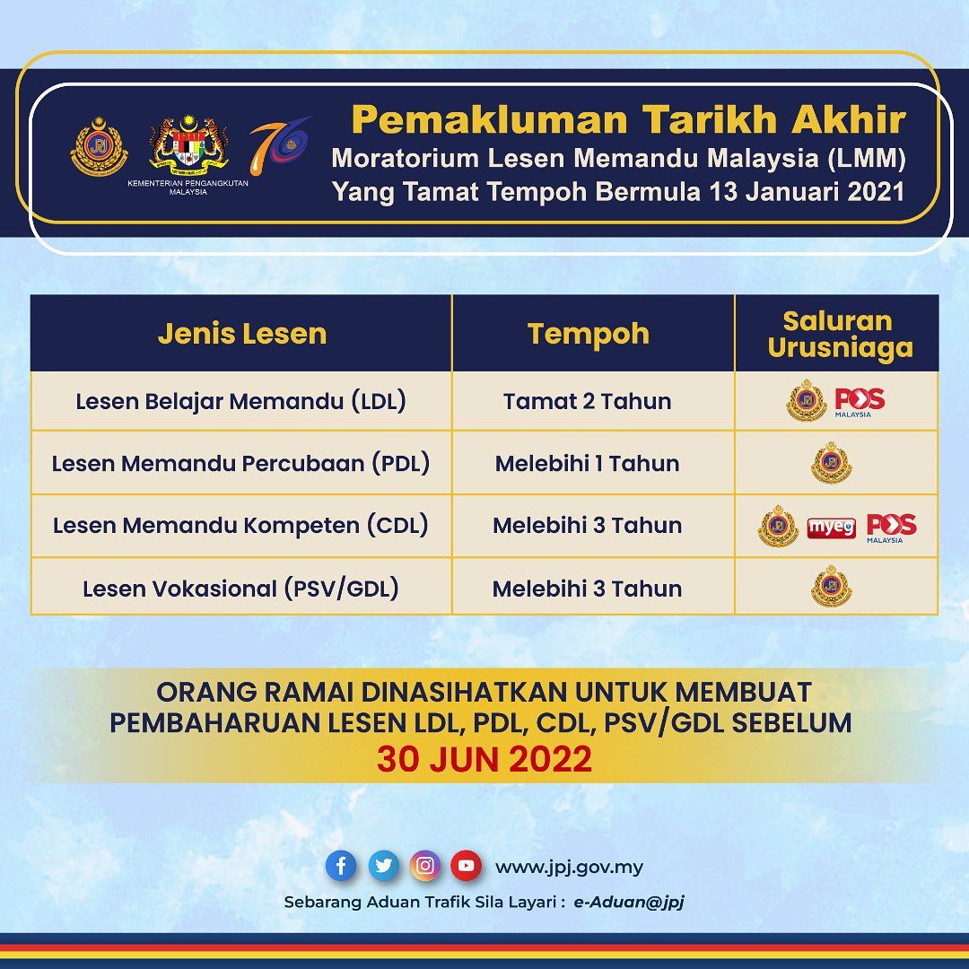 陆路交通局在脸书发文提醒,在去年1月13日后逾期的正式驾照(CDL)、罗厘驾驶执照(GDL)和商用车辆执照(PSV)、P牌驾照(PDL)及L牌驾照(LDL)持有人,若逾期1至3年,必须在本月30日之前更新。