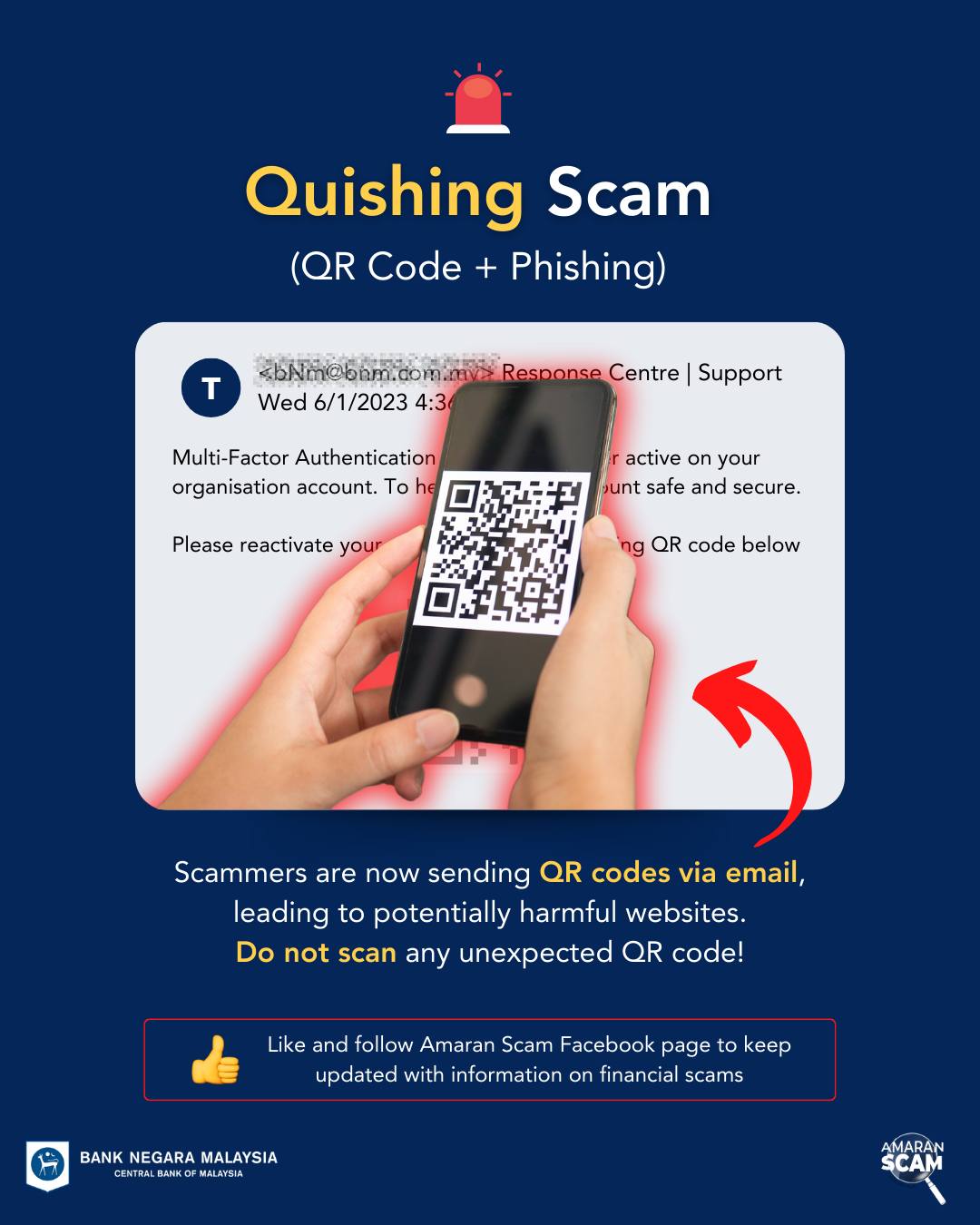 国行“Amaran Scam”脸书专页发文提醒,提防最新的诈骗手段——二维码网络钓鱼(Quishing)。