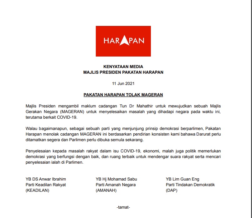 公正党主席安华、行动党秘书长林冠英和诚信党主席莫哈末沙布发表联合声明指出,希盟的立场是,必须立即结束紧急状态,重新召开国会。