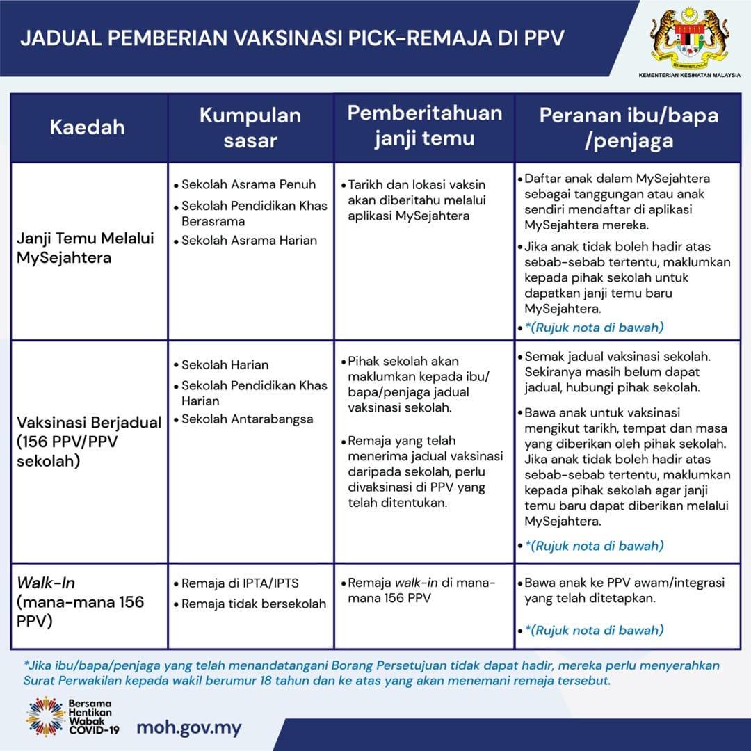 📌青少年可通过MySejahtera预约、登门接种或按时间表接种,详情如下: