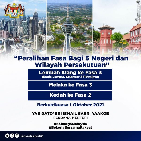 首相依斯迈沙比里宣布,吉隆坡、雪兰莪、布城及马六甲将进入国家复苏计划第三阶段;吉打则从第一阶段进入第二阶段。