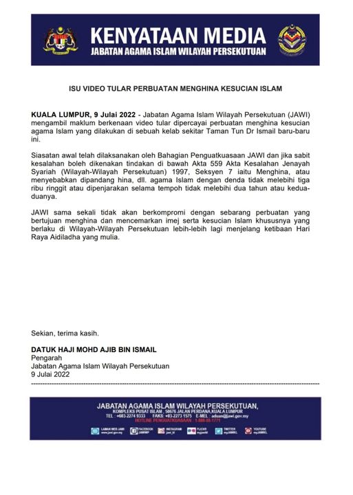 联邦直辖区宗教局局长阿吉依斯迈发文告称,该局已留意到网上流传的视频,而该局执法组已展开初步调查。