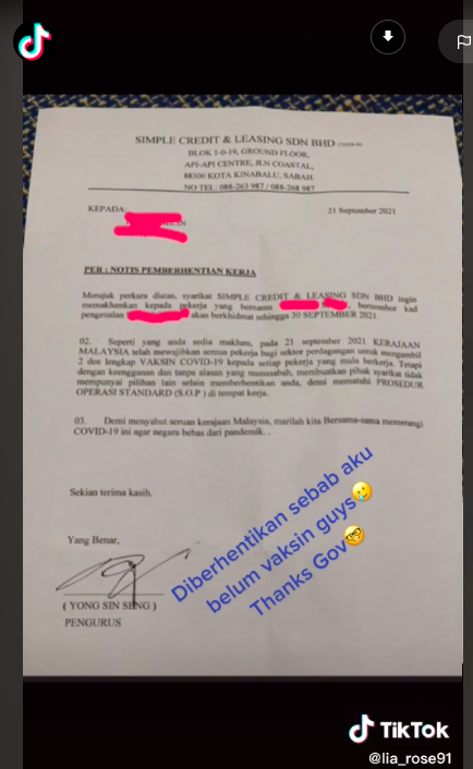 根据女子展示的解雇信函,公司表明,由于政府宣布贸易领域复工,所有员工都必须完成接种,但女子因为无合理理由拒绝接种,公司别无选择下,只能终止女子的服务,以遵守职场标准作业程序。