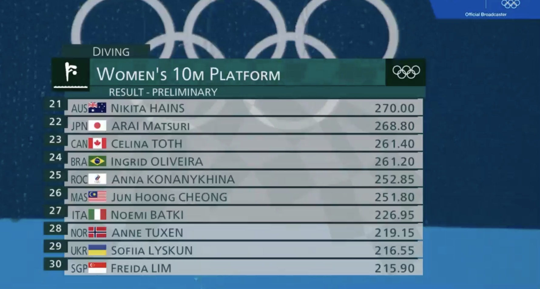 至于张俊虹,第一及第二跳出现很大的失误,两跳才为她取得70分左右,随后她调整慢慢追分,但始终欲振乏力,未能追得半决赛入门券,最终以251.8分,在30名选手中排在第26位,只能遗憾告别本届的赛会。