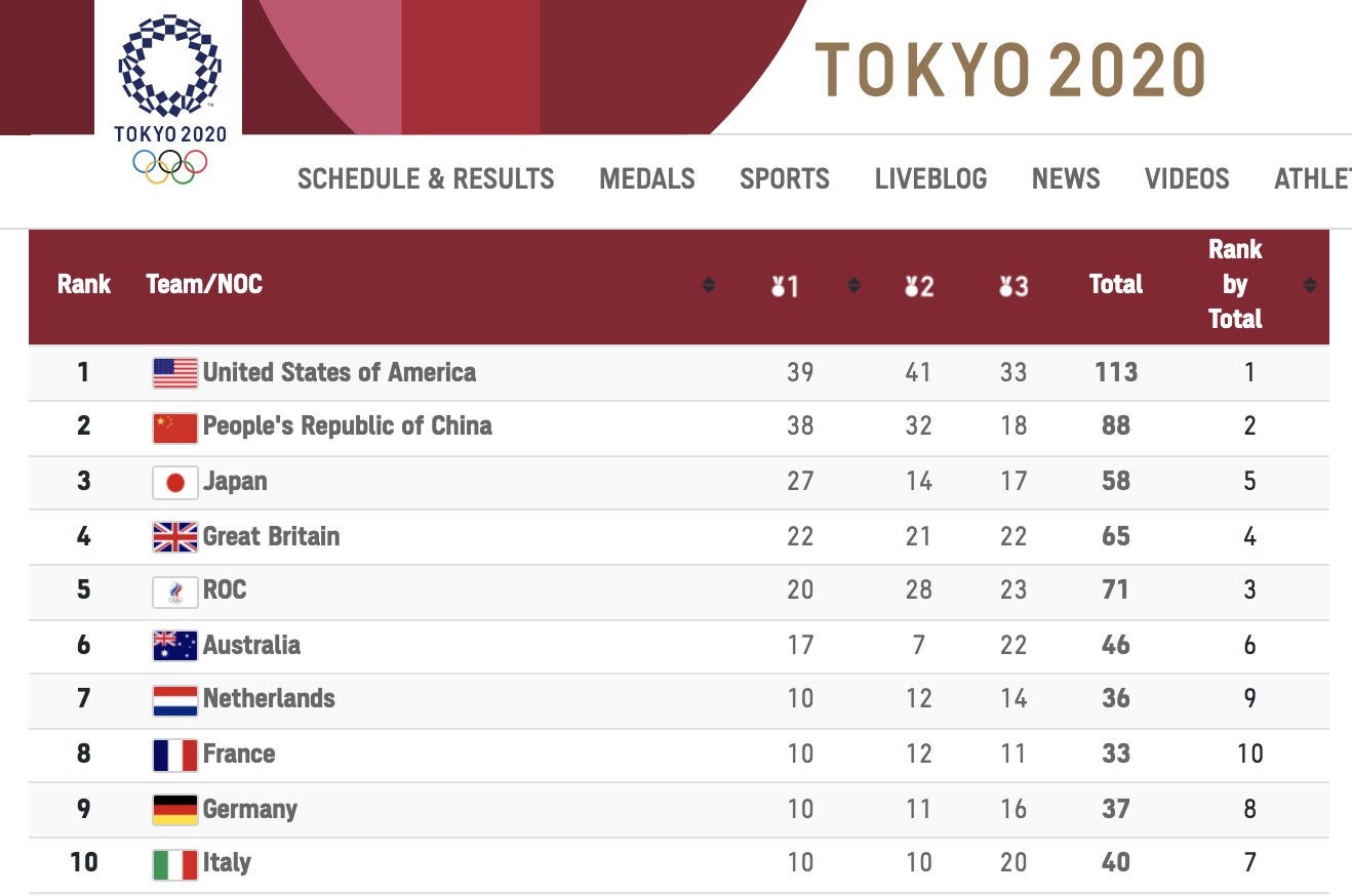 在中美榜首争夺战结束后。本届奥运会奖牌榜前10名也全部确定,顺序是美国(39金)、中国(38金)、日本(27金)、英国(21金)、俄罗斯奥委会(20金)、澳洲(17金)、荷兰(10金)、德国(10金)、意大利(10金)和法国(9金)。