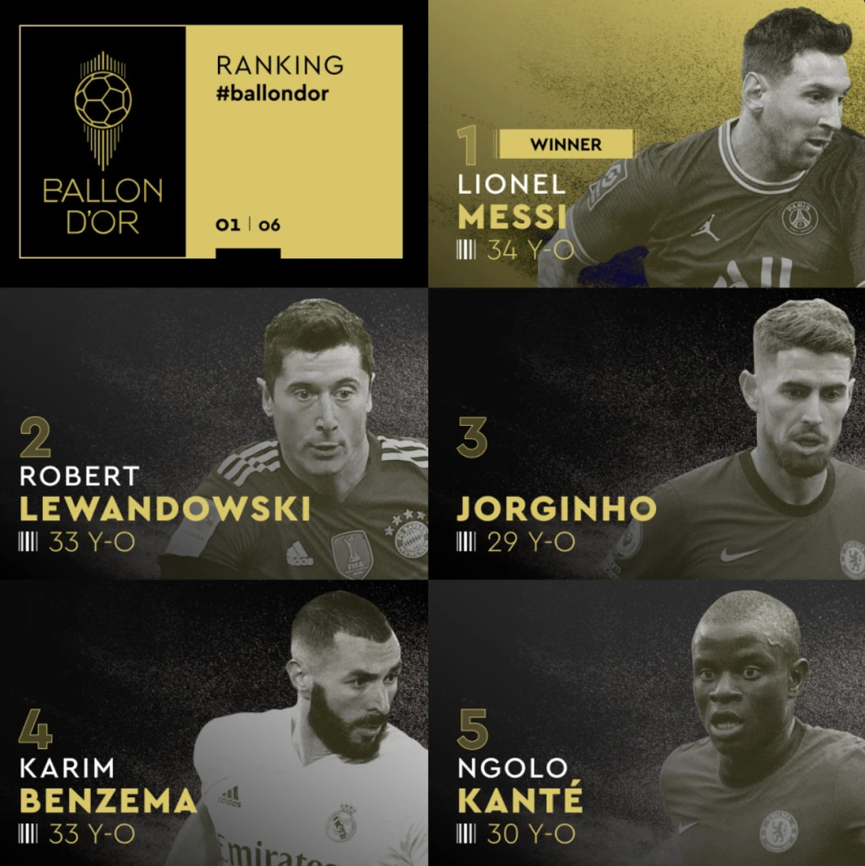 梅西个人第7次加冕,第2-10位顺序排位是莱万、若日尼奥、本泽马、坎特、C罗、萨拉赫、德布劳内、姆巴佩、多纳鲁马。