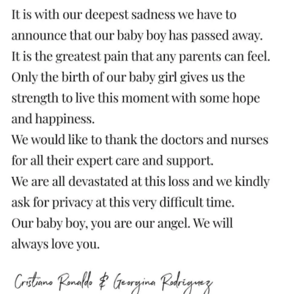 曼联球星C纳多(Cristiano Ronaldo)于社交媒体上宣布,与女友洛迪古丝(Georgina Rodriguez)的一对龙凤胎,其中男婴刚出生就夭折,只有女婴顺利出生,C罗于贴文表示“这是所有父母的最痛”。
