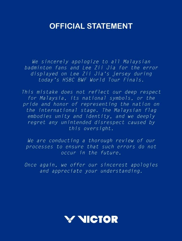 VICTOR较后通过IG限动发文道歉:“我们真诚向所有马来西亚羽球迷及李梓嘉道歉,因李梓嘉所今天在世界羽联年终总决赛比赛穿着的球衣出现瑕疵。”