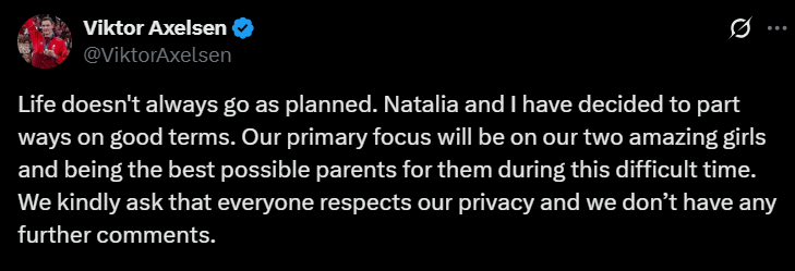 他在社媒发文:“生活不会总是如我们所愿,我与娜塔莉亚决定和平分手,这段艰难时期,我们会把主要精力放在照顾两个可爱的女儿,努力成为她们最好的父母。”