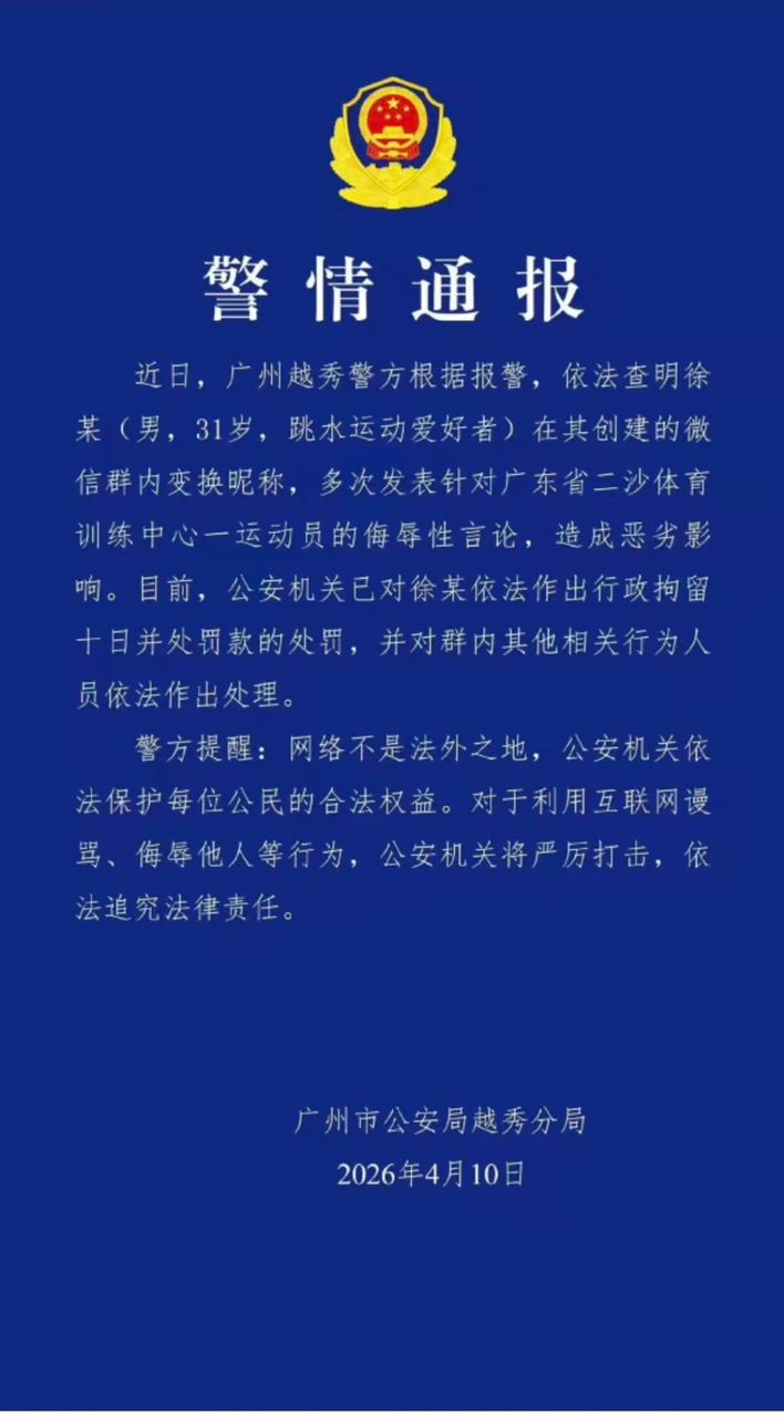 广州越秀警方指出,涉案的31岁徐姓男子为跳水爱好者,他在所创建的微信群中多次更换网名,并反复发布针对全红婵的侮辱性言论,造成不良社会影响。