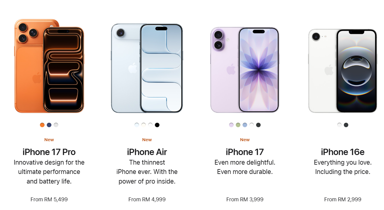 全系列机型容量自256GB起,iPhone17售价为3999令吉起、iPhone17 Pro 售价为5499令吉起、iPhone17 Pro Max 5999令吉起,iPhone Air首次推出售价为4999令吉起。;9月12日开放预购、19日正式上市。苹果公司秋季发表会进行线上直播,执行长库克(Tim Cook)现身苹果加州总部,依序揭晓新一代无线耳机AirPods Pro3、智慧手表Apple Watch Series11、Apple Watch SE3、Apple Watch Ultra,及iPhone17系列新机(标准版、Air、Pro、Pro Max)。
