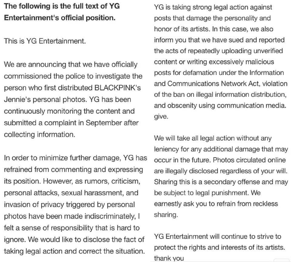 BLACKPINK所属的经纪公司YG娱乐自始至终没有回应Jennie私密照事件,时至今日YG终于正式发出声明强调,该公司经请警方调查Jennie照片的最初散布者,而YG娱乐在这段时间也一直持续搜证,直到证据够充足,才选择在9月底提交诉状。