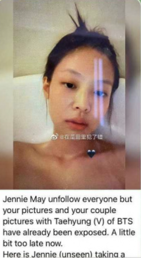 另外,骇客还流出一张存在Jennie手机里的裸身肌肉猛男照,在下半身的部分打上大大的「Breaking News」字幕,虽然猛男戴着口罩,无法辨识出身分,但对于Jennie的清纯形象无疑是沉重的伤害。