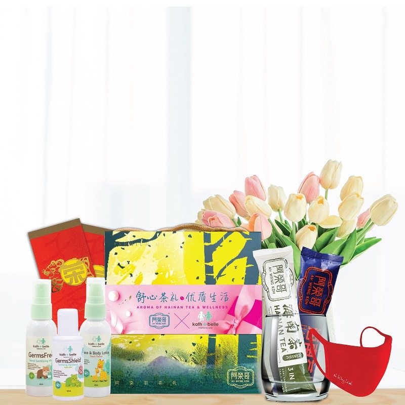 舒心茶礼 :经典人气款3合1海南茶(8条)、2合1海南茶(8条)、Kath+Belle消毒洗手液1支 、面部与身体乳液(桃子味)1支、消毒喷雾1支 ,随礼盒附送阿荣哥限量版 【荣虎仔利是封】及阿荣哥口罩(直到送完为止)