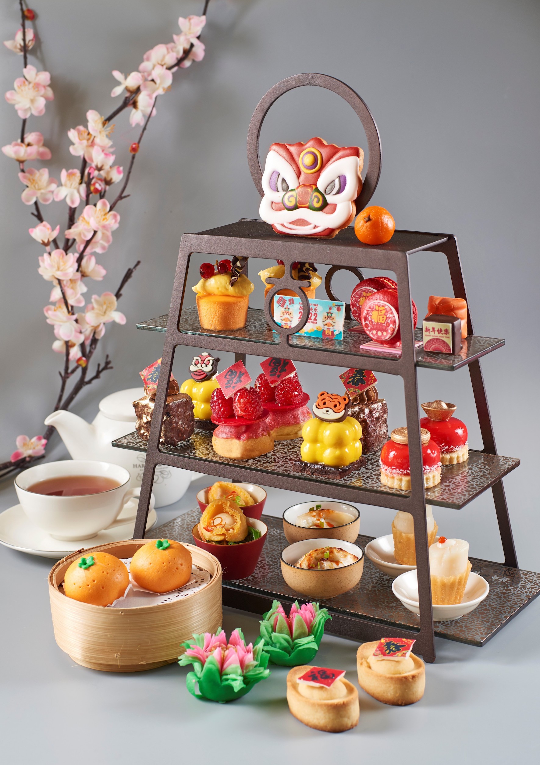 “Huat”下午茶内含15种美食,三层式的下午茶架子经典又大器。酒廊优雅的家具和落地窗的映衬下,再搭配一系列诱人的甜味和咸味美食惊艳你的味蕾。这套下午茶的亮点包括鲍鱼裙带菜沙拉、年糕炸芝麻球、芝麻酱橘子、上海饺子四川风味、莲花酥、水果和扇贝沙拉、橙芝士蛋糕、金巧克力布朗尼、芒果慕斯、浆果芝士慕斯、覆盆子奶油泡芙、人民币巧克力果仁糖、菠萝饼干、人民币狮子饼干和马卡龙。