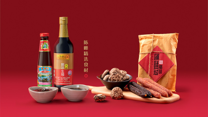 礼盒内的食材都是由陈峰精挑细选,包括李錦記旧庄特级蚝油 、李錦記特级鲜味生抽,以及匯味冠腊肠 、腊润肠、腊肉,还有花菇及峰哥的独家食谱。李錦記旧庄蚝油是采用上等鲜蚝制造,原味十足,是蚝油中的极品,搭配豉油中之极品的李錦記特级鲜味生抽,真是天衣无缝;而匯味冠的腊味更是陈峰大力推荐的,它肉质鲜美,肥瘦适中,香而不腻,当腊味与酱汁完美搭配在一起时,就成了峰哥腊味饭的灵魂,最独一无二的峰味。