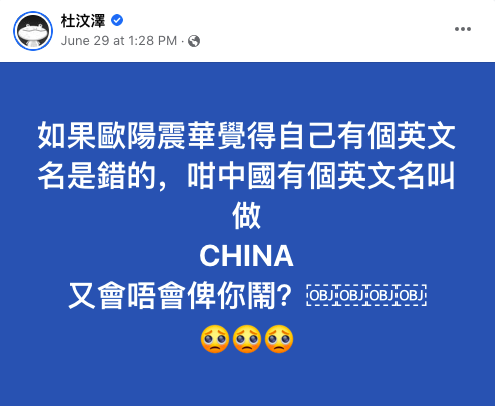 杜汶泽在脸书写道:如果欧阳震华觉得自己有个英文名字是错的,那么中国有个英文名字叫CHINA,又会不会被骂?