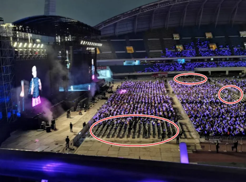 不过根据曝光的视频,现场出现大量空座位,而且肉眼明显可见连续多排位置空了出来,当台下歌迷挥着萤光棒气氛高涨时,在旁边的空座位更显得了无人烟,形成强大对比,乍看之下有些尴尬。